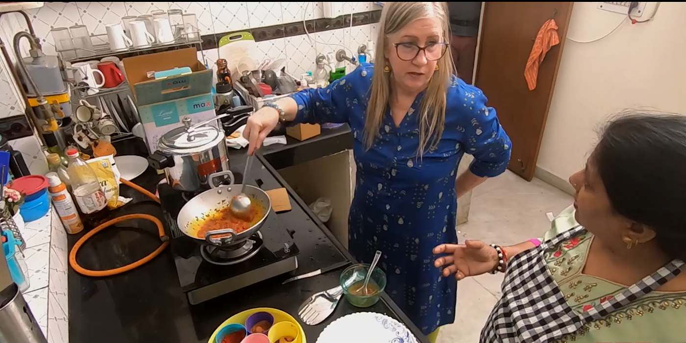 “Você não sabe nada”, diz a mãe de Sumit enquanto tenta ensinar Jenny a cozinhar. “Você não serve para nada.”